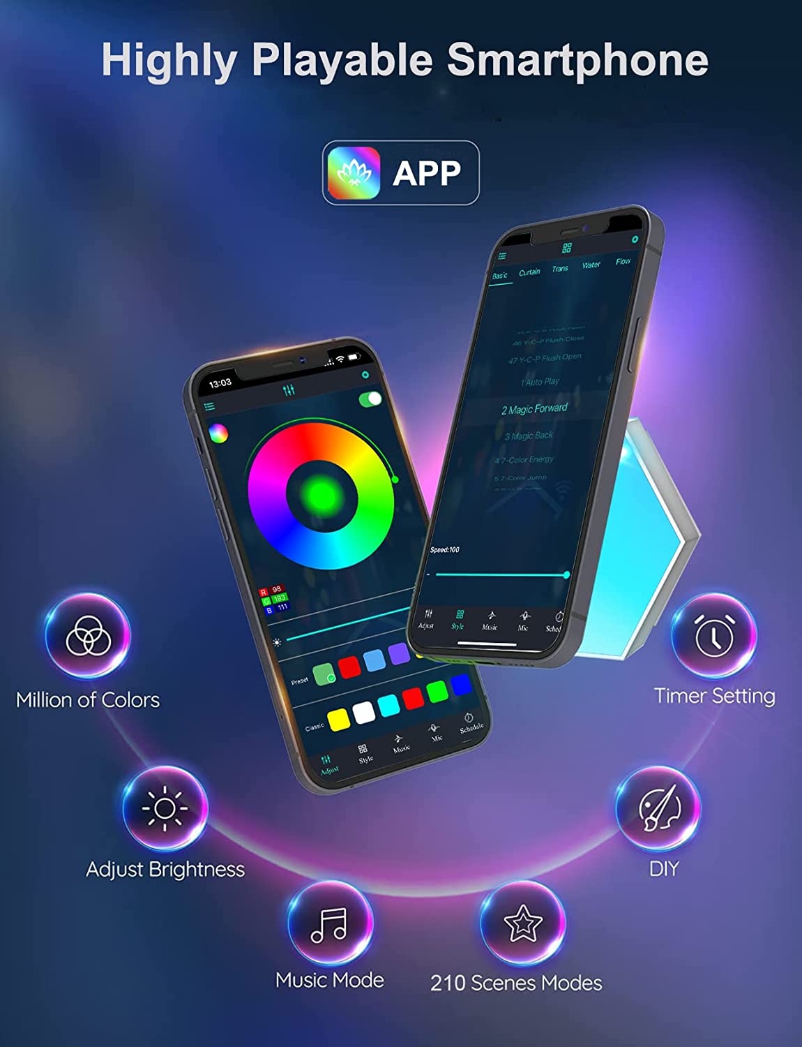 【Customize Your RGB Wall Pattern】DIY your own hexagon led lights layout and then add RGB colors is the most interesting thing. Create personalized lighting that reflects your style or any shape or art you want to express.Upgrade any space with your own unique layouts, and add custom RGB color palettes to make any rooms feel brand new.
