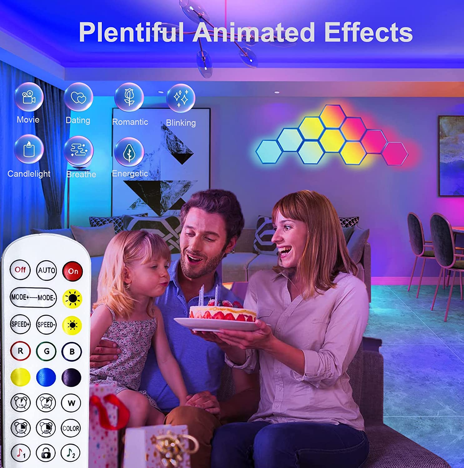 【Hexagon Wall Lights】We make improvements to smart chips, now the led light wall panels can be controlled by remote and APP simultaneously. Add cool lights for room and deck out your gaming room, battlestation, entertainment area, TV, living room, bedroom with these led hexagon lights to create the ultimate RGB vibe. Geometric splicing modular lights, with endless design possibilities, you can let your imagination run wild.