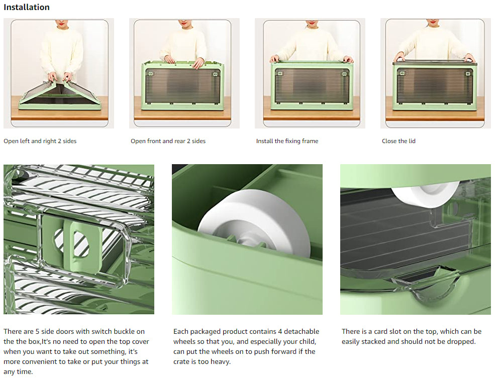 Design:The top and sides of the collapsible storage bin are made of transparent plastic, and here are 5 side doors on the front and back of the box, it’s no need to open the top cover when you want to take out something , it’s more convenient to take or put your things at any time.