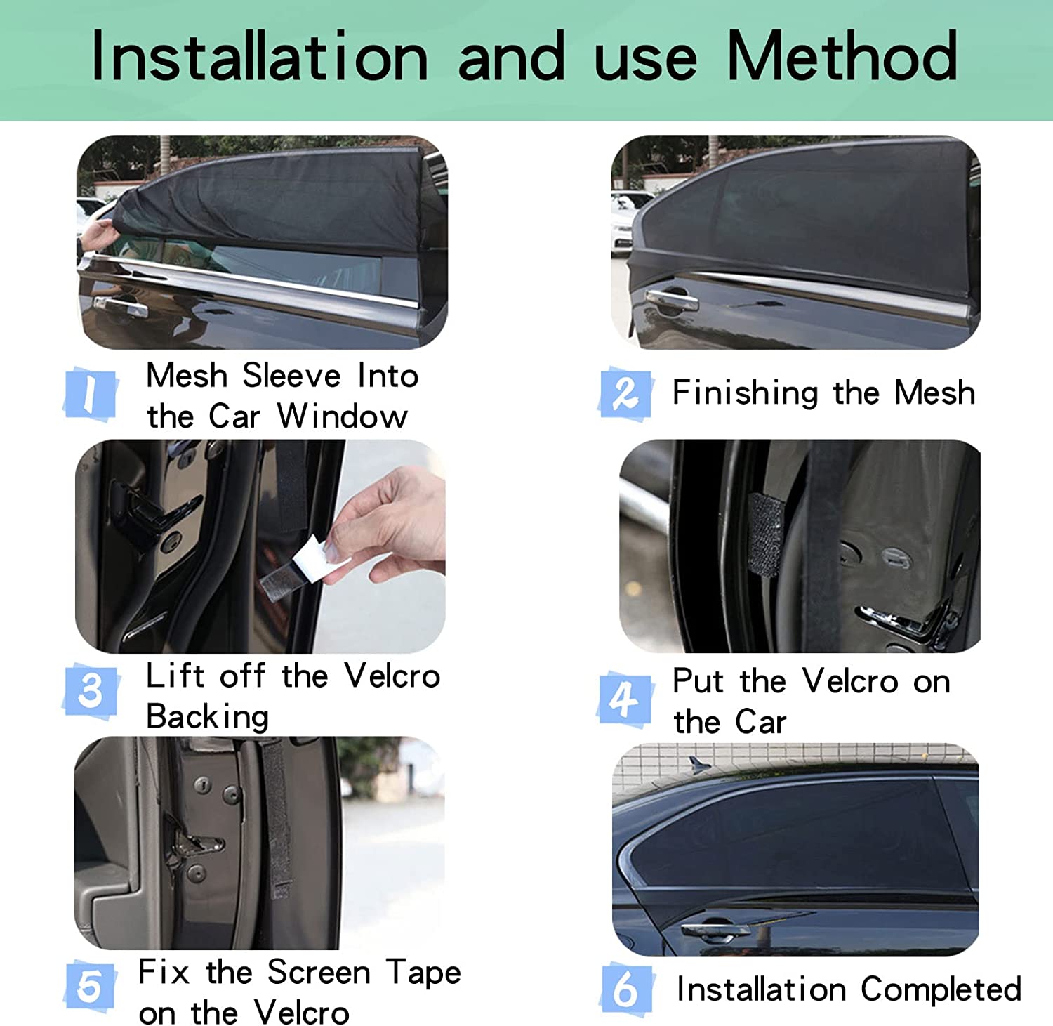 Just open the car door, put the car shade mesh over the side window and everything is ok.Please notes:This set is for rear side windows.We give away a large piece of non-slip mat, don't forget to use it, hope you will like it.