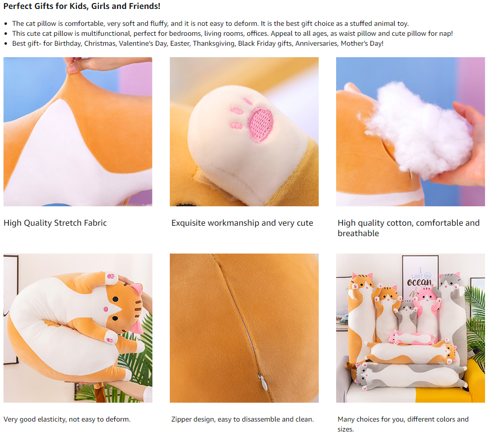 【Cute and funny design】: A cute and funny cat stuffed animal pillow with round eyes, a smiling little mouth,soft fabric.When you are in a bad mood, you can hit and pressure the plush pillow. The cute cat plush toy will help you reduce the pressure of work.