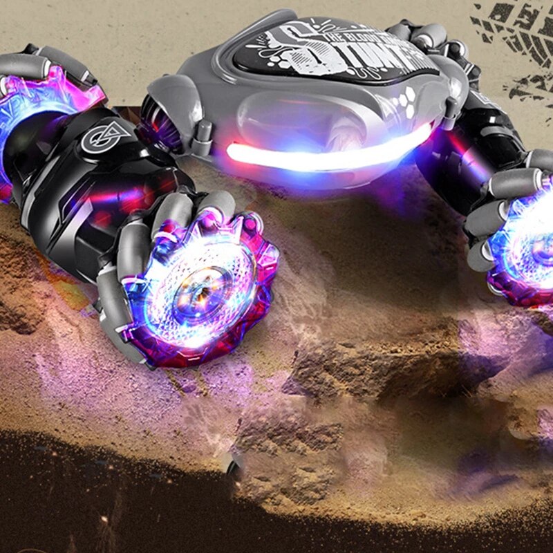 【Double Ways Control Modes】Our rc stunt car is upgraded with 2 control ways: gravity sensor watch controland remote controller. You just need to wear a gesture-sensing watch and give a gesture, and the remote control car will act accordingly. Or you can easy to control remote controller with 2.4ghz transmitter strength, that is sensitive and responsive, you can be maneuvered even from a far distance.(You can not control the car toy with two way at the same time.)