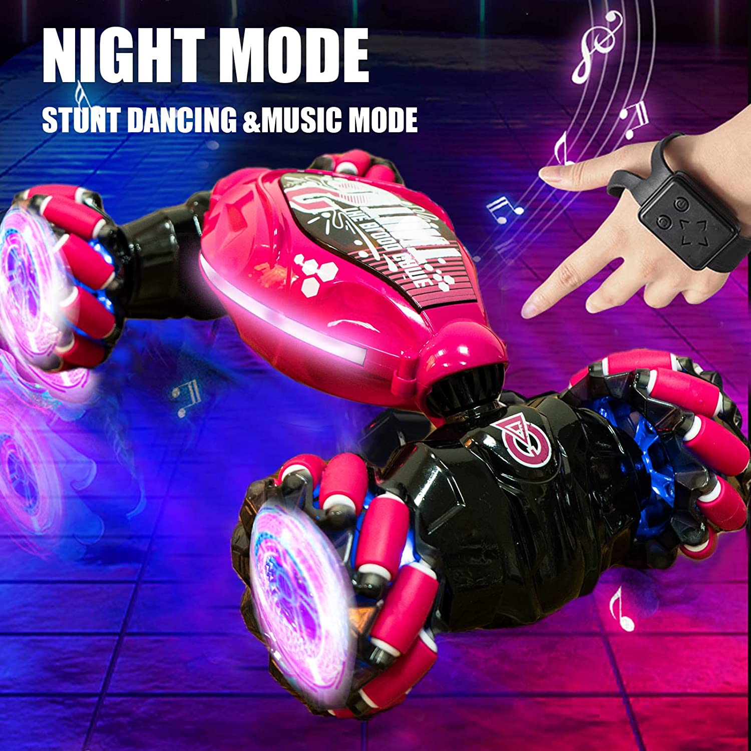 Our rc stunt car is upgraded with 2 control ways: gravity sensor watch controland remote controller. You just need to wear a gesture-sensing watch and give a gesture, and the remote control car will act accordingly. Or you can easy to control remote controller with 2.4ghz transmitter strength, that is sensitive and responsive, you can be maneuvered even from a far distance.(You can not control the car toy with two way at the same time.)