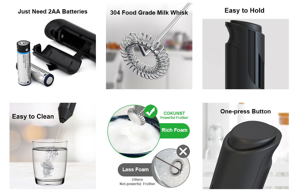 Simple one-touch button with a low noise level, just put it into a container with liquid food up to approx 1/3 to froth, and it will stop work upon you release the button. The drink mixer can be used for more than 1000 times.