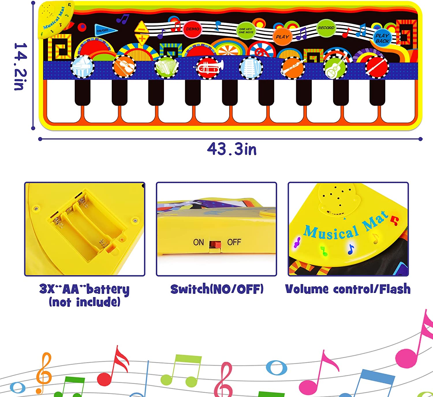 【More Fun and More Functions】This music toy mat has 5 modes(demo,one-click annotation, play, playback and record). The demo mode can play 9 melodies,the play mode has 9 music keys and 8 instrument sounds. The playback and record modes for kids to record their own music and playback it, keeps your child in fun modes for hours to explore and train themselves in music knowledge.