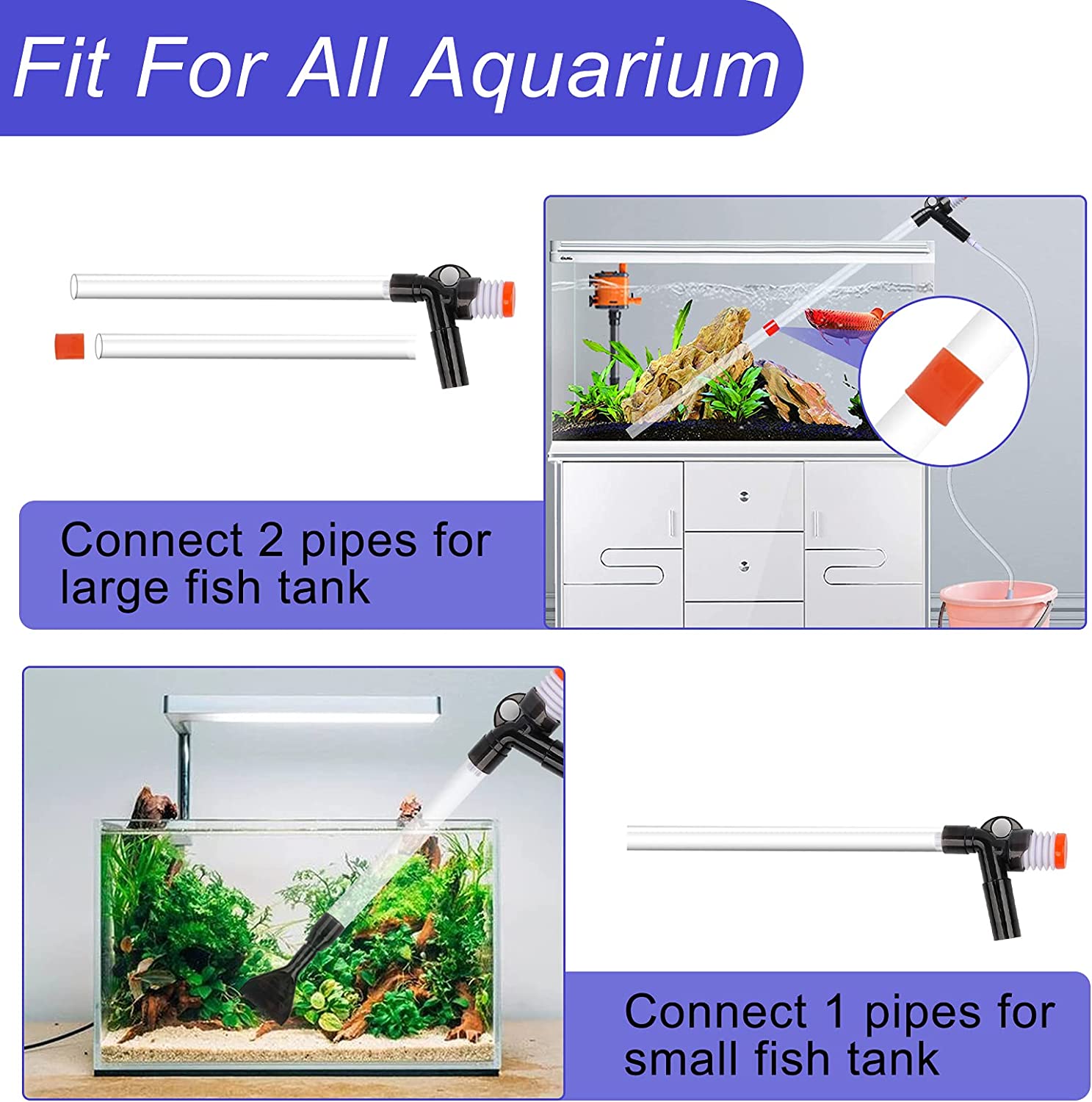 Water changing, Sand washing and Decontamination. The new upgraded fish tank cleaner is simple and easy to use, it can effectively and quickly suck out gravel, fish excrement and other dirt, and complete the daily water change of the fish tank. Perfect for complete aquarium cleaning or quick spot maintenance.