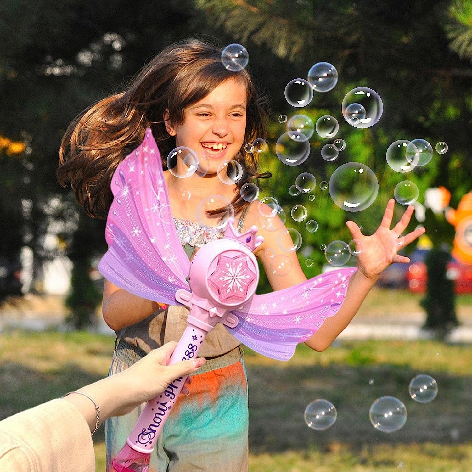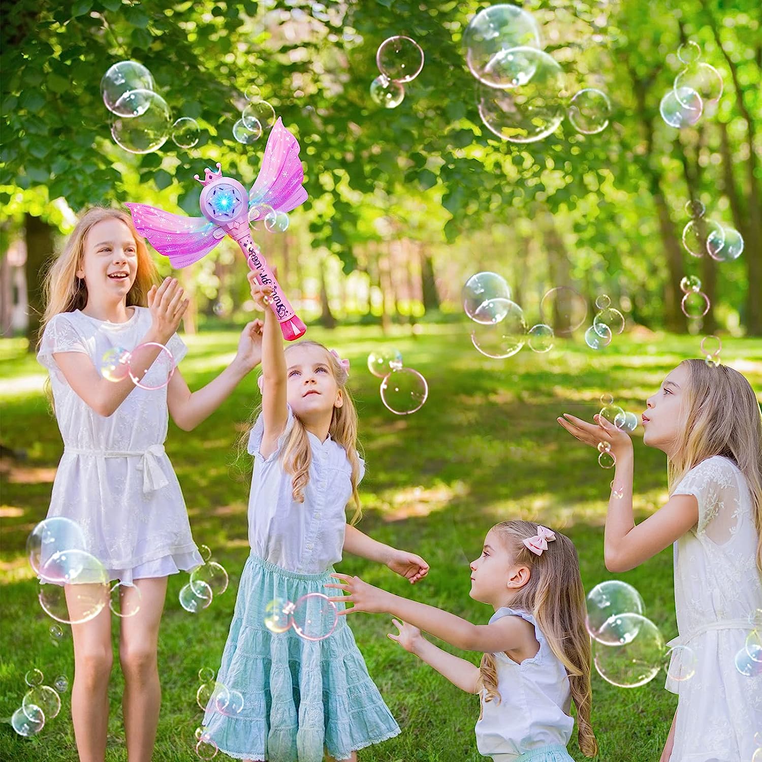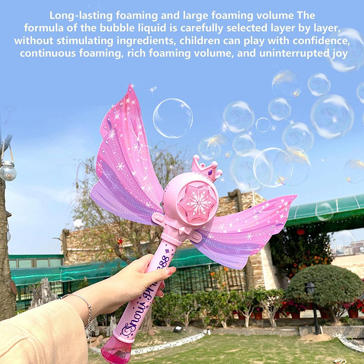 Three AA 1.5V NEW batteries are required for the bubble machine. The wings are also detachable. When the wings are installed, it is an adorable butterfly; when they are removed, it is a fashionable magic wand. Compared with others, this wing is not easy to fall off, and children can hold it and play everywhere.