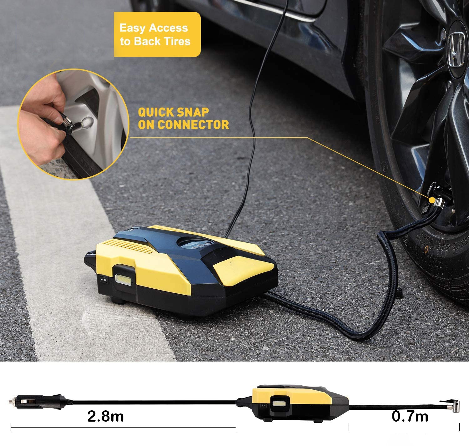 【Fast Inflation & Accurate Tire Pressure】The 12V DC portable air compressor has digital gauge display screen, easy readout. Plug directly into DC12V Cigarette Lighter Socket of your vehicle. Tire pump with 120W high power engine delivers fast inflation rate.