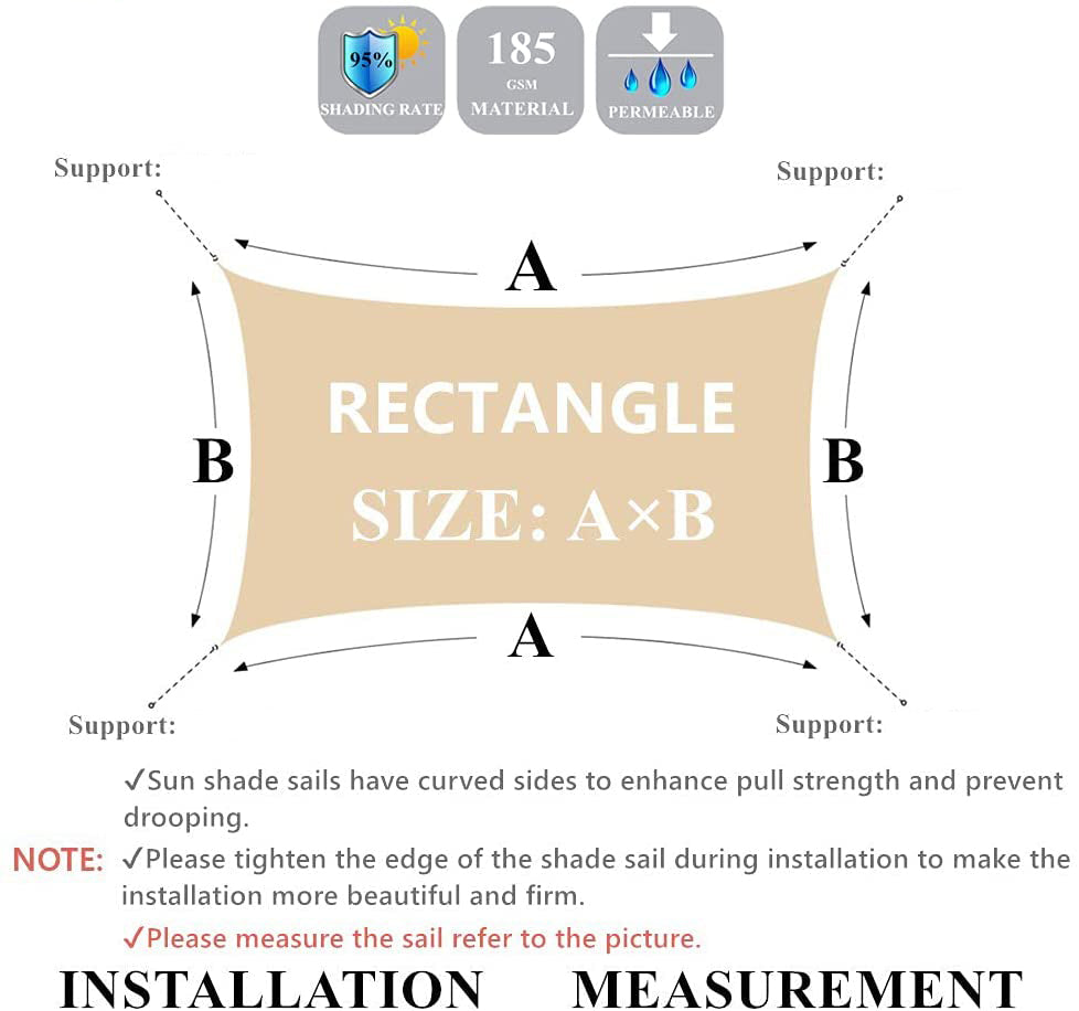 Purchase Information - Please measure the size of the installation area accurately before purchasing. The shade sail's edges are curved so that the actual shaded area is slightly smaller, with tolerances of 10-12 cm on each side