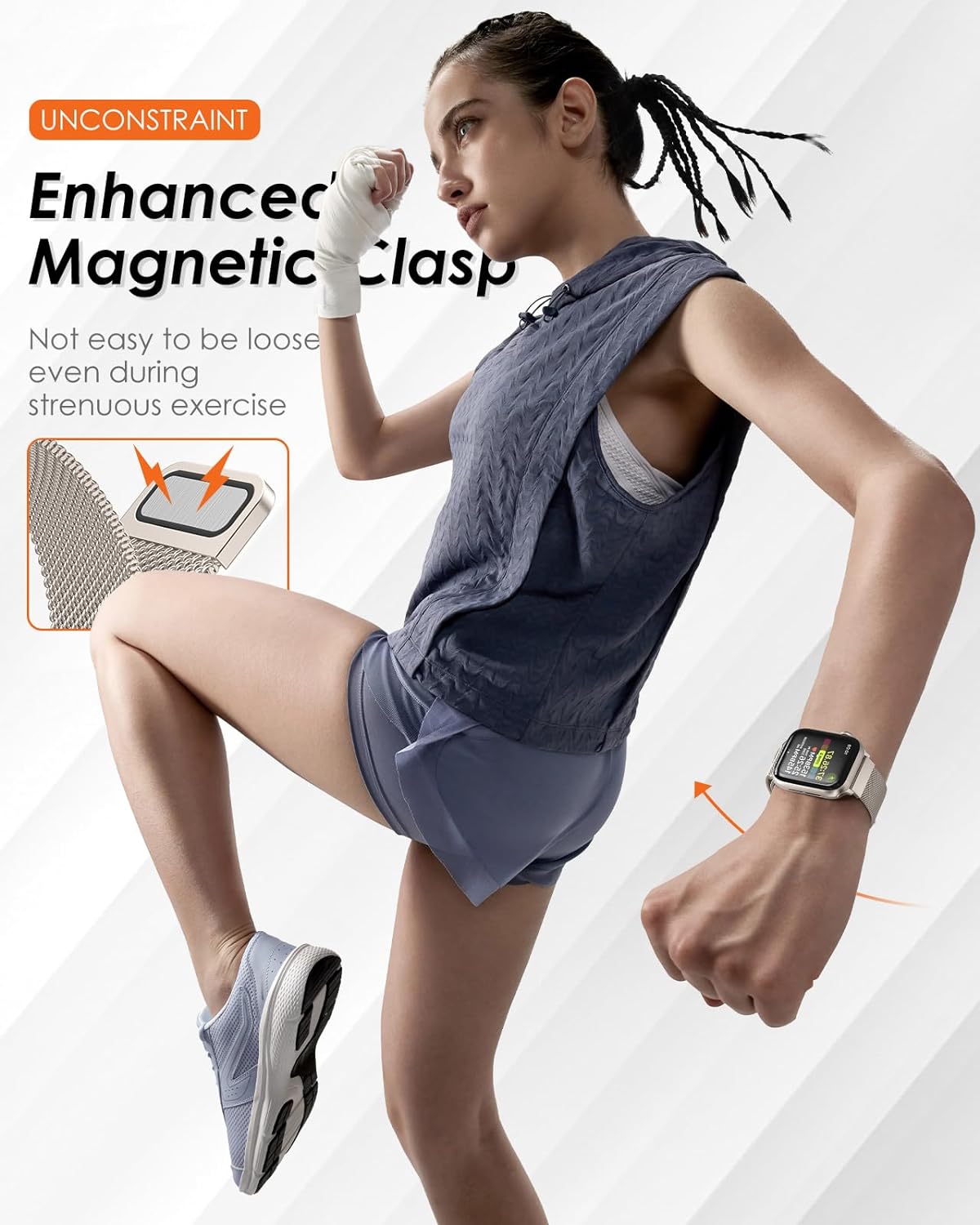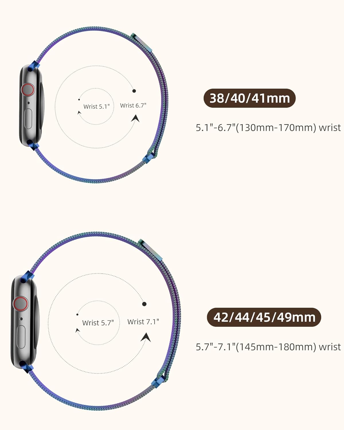 【Adjustable Size】 The metal watch band is copmpatible with apple watch series 9 8 7 6 5 4 3 2 1 SE SE2 Ultra. Magnetic connector and mesh loop design, allows you loosen or tighten in seconds. 38mm 40mm 41mm band fits 5.1"-6.7"(130-170mm) wrists; 42mm 44mm 45mm 49mm band fits 5.7"-7.1"(145-180mm) wrist