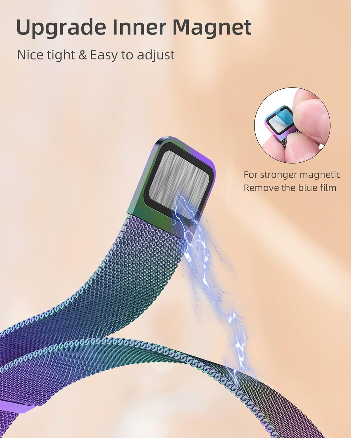 【Upgrade Magnetic Buckle】 The slim metal band with new inner magnet lock design, tight seal to stay latched, smooth to put on and slide off, lock your watch precisely and securely. With advanced electroplating technology, no more worries about getting loosen or fade when wearing. Note: Required stronger magnetic, pls remove the inner magnet film