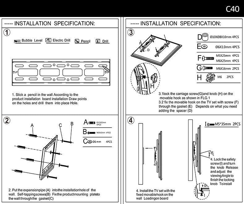 Our TV bracket 43 inch compatible VESA holes: 400x400/400x300/400x200/300x300/200x200/200x100/100x100 mm. Please confirm the VESA, weight and size specification of your TV before purchasing.