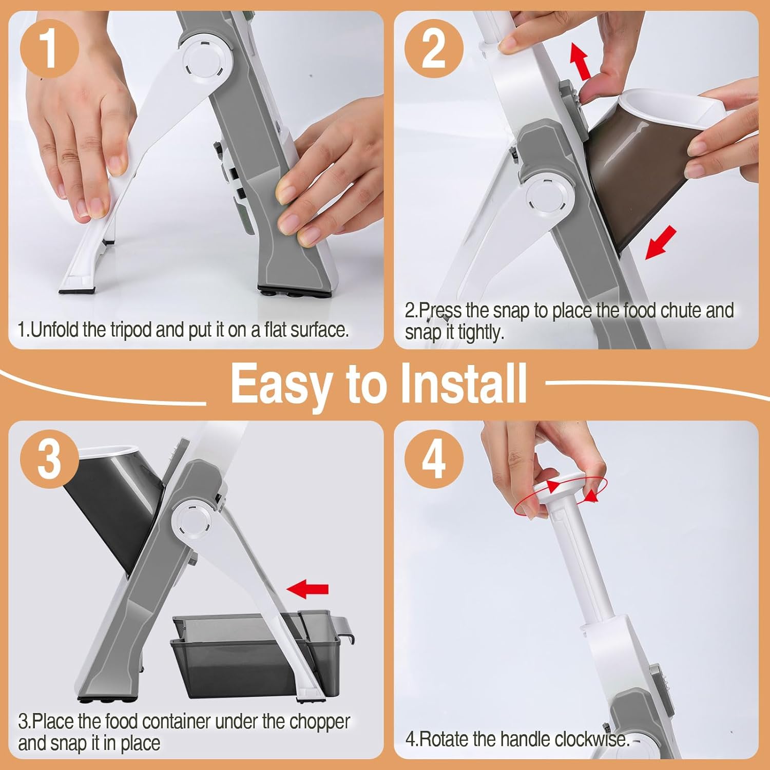High Quality & Easy to Use, the vegetable chopper shell is made of eco-friendly ABS with built-in rust-resistant stainless steel blades, no need to change blades, the unit has a handful of mini suction cup “feet” on the bottom to prevent sliding around, and the tripod stand is designed to run more stably