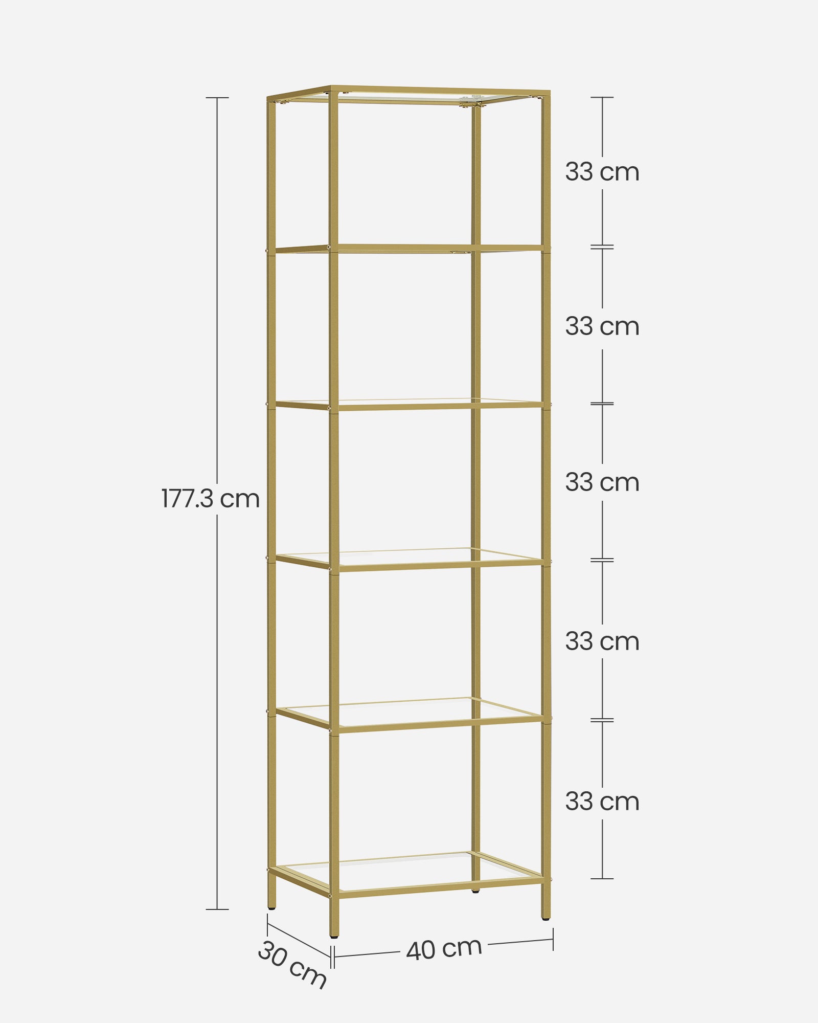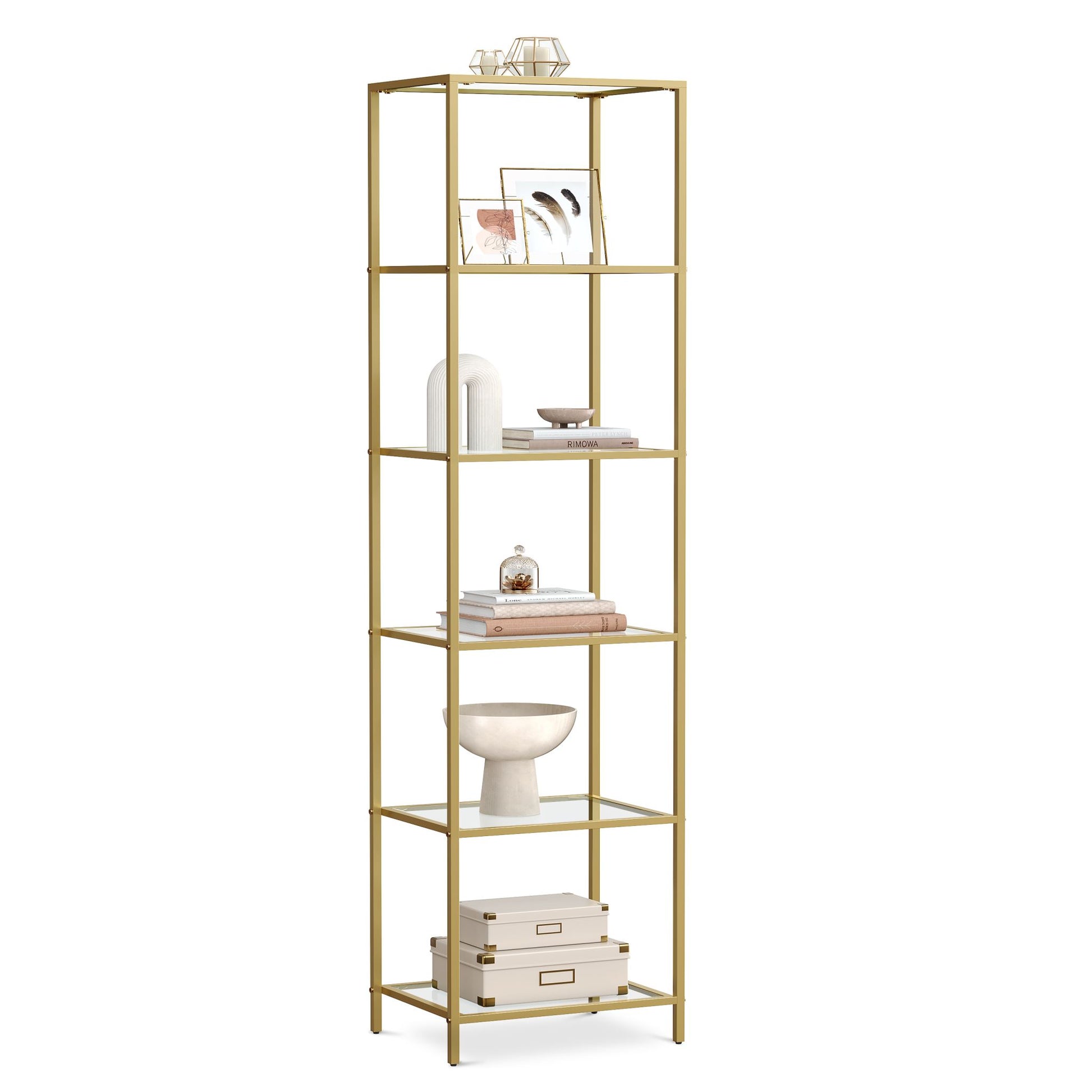 - [Display Your Faves] With transparent glass shelves and black frame, this 6-tier shelf boasts stunning modern minimalism. This tall shelf allows you to display your greenery, books, and collectibles while elevating the look of your space