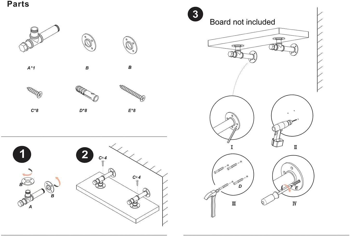 DIY Brackets: Brackets for shelves are easy to install, you just need to secure the pipe shelving, then can put a wood board on it. (NOTE: Wooden board is not contained in the package)
